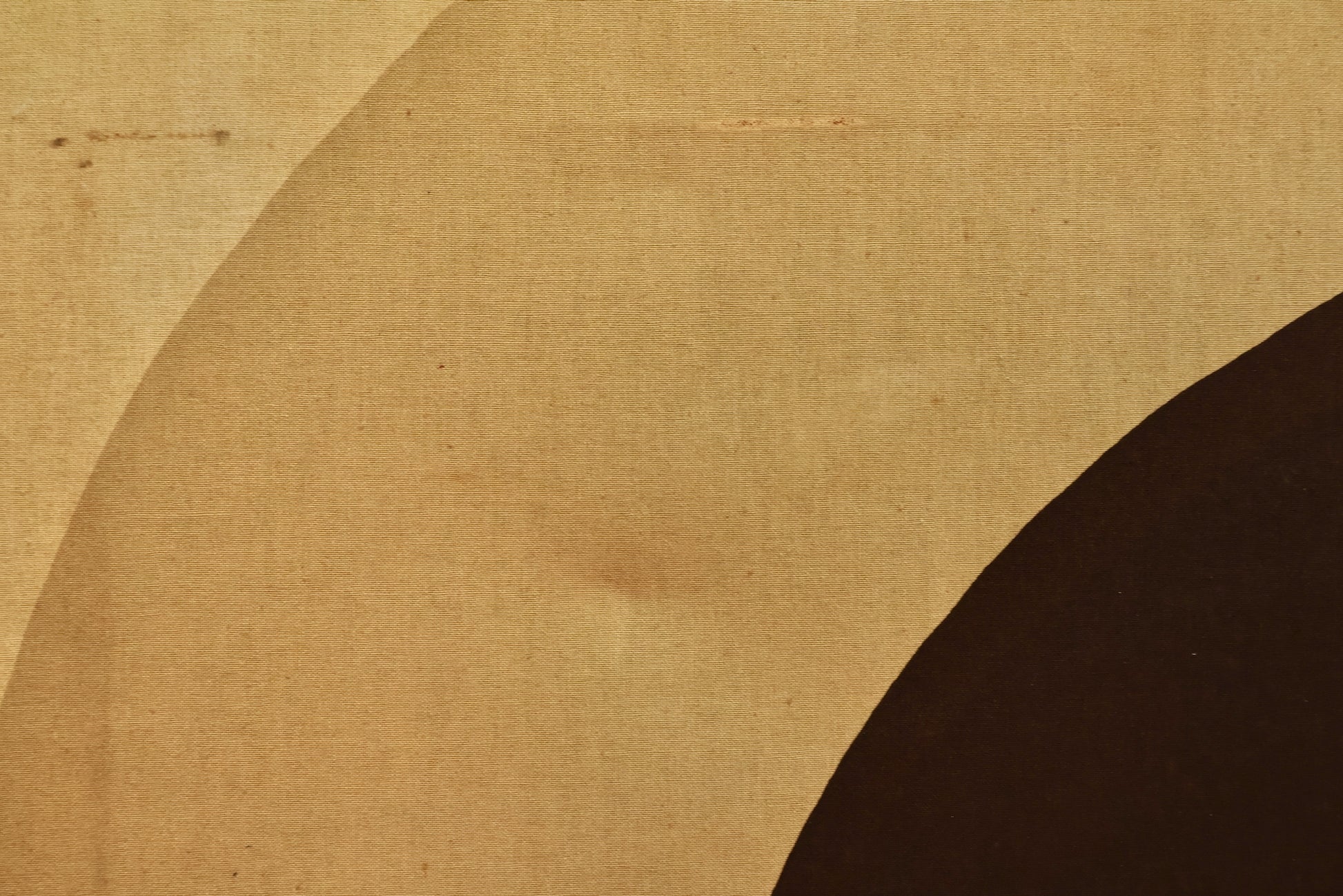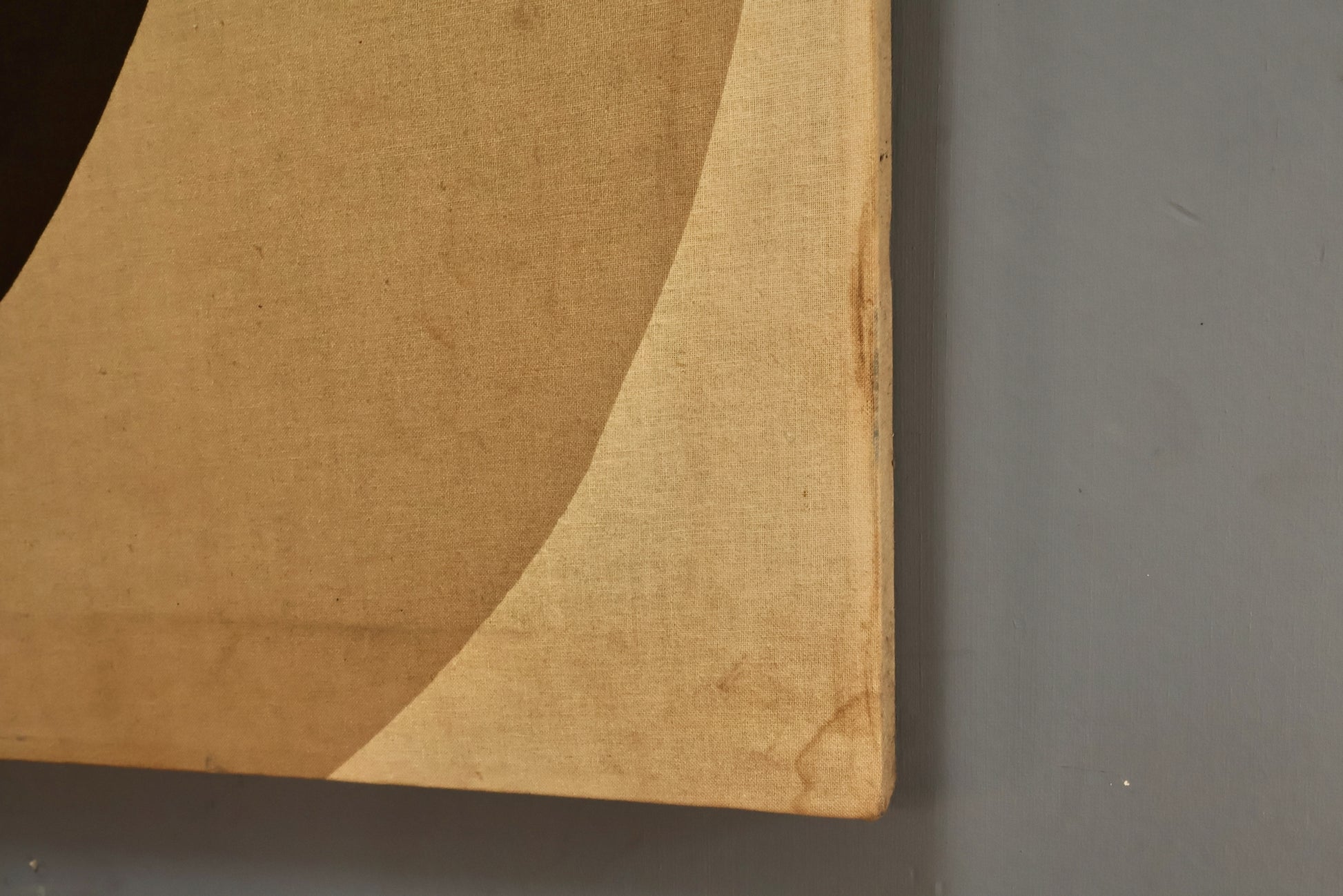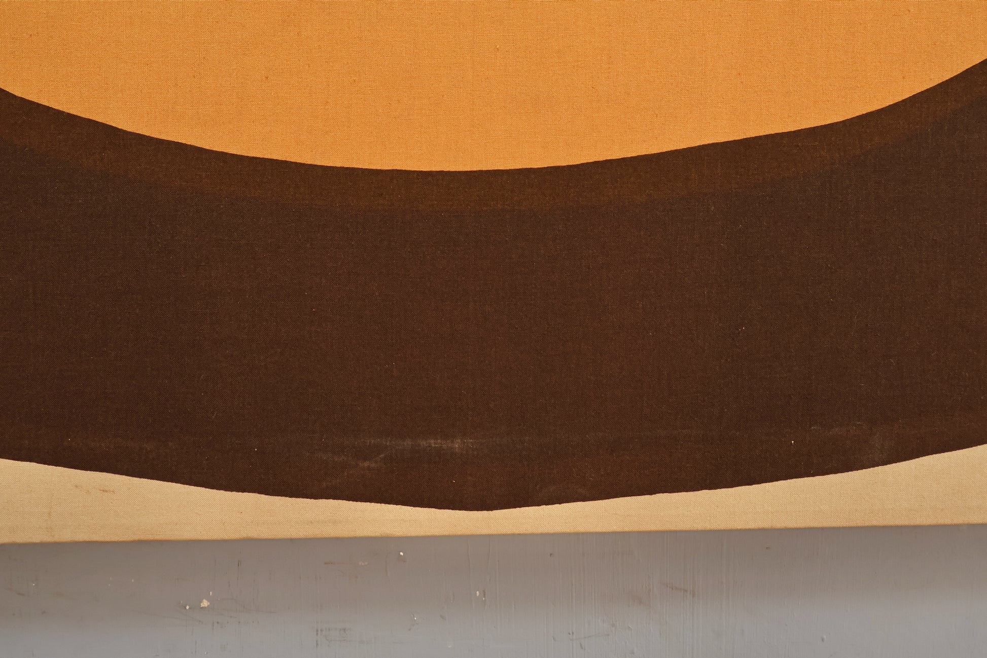 Mesmerizing stretched textile art. Manufactured by Marimekko in 1963. Fabric stretched over a canvas frame. Could be hung vertically or horizontally on the frame. Not wired. Some stains along the edges and minor discoloration from age.