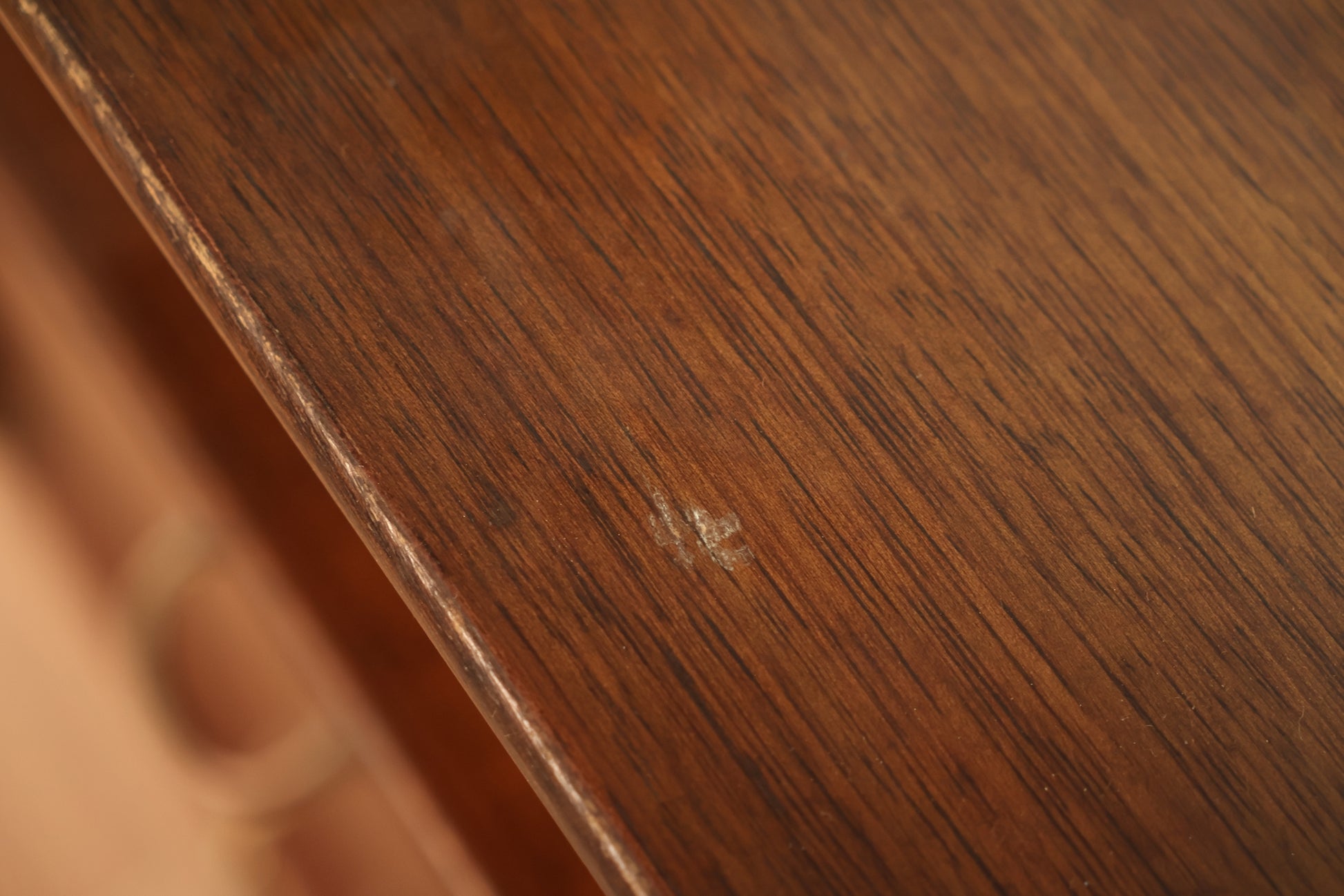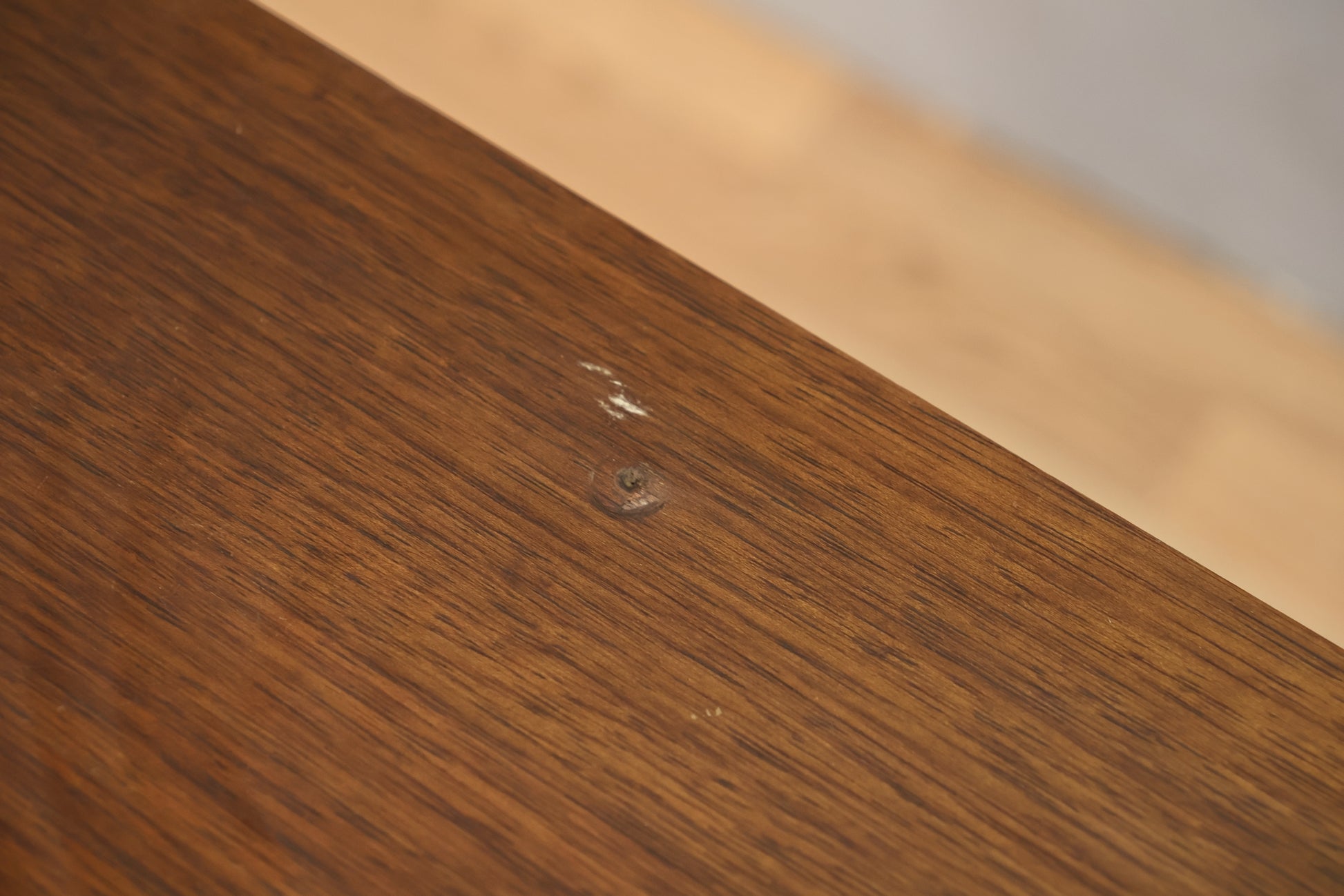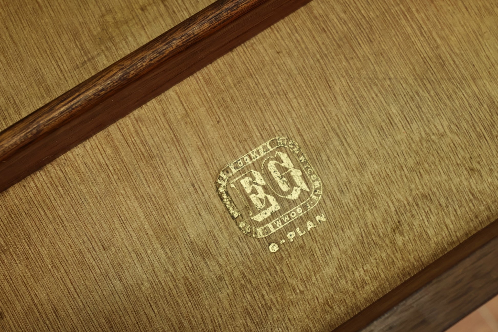 Gorgeous G-Plan desk from the 1960s. Made from afrormosia and ebonized wood, finished with elegant golden brass pulls on its five drawers. Eye-catching floating shape sure to make this the highlight of any room. Back is not finished. Kneehole section of desk is 18.5" wide and 25" high (on the small/low side) - worth keeping in mind when it comes to pairing with a chair. Top drawer is a little sticky. In generally good condition, light wear. Drawers are a little sticky.